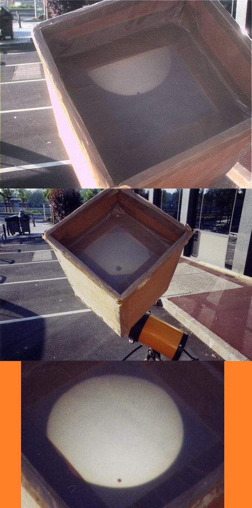 Fabriquer une telle boîte de projection est très simple : prenez une boîte à chaussure et remplacez un côté par un papier calque. Percez un trou du côté opposé pour pouvoir soit visser une bague adaptatrice soit fixer l'occulaire après avoir fait la mise au point sur un objet lointain.